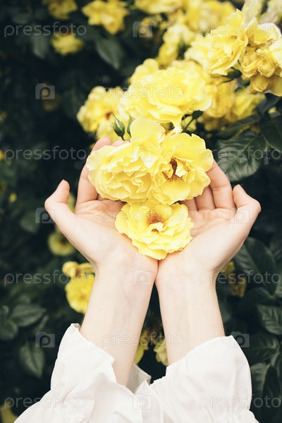 Руки, держащие яркие желтые розы на фоне пышного зеленого листья, демонстрируют деликатные лепестки и естественную красоту цветов в садовой обстановке