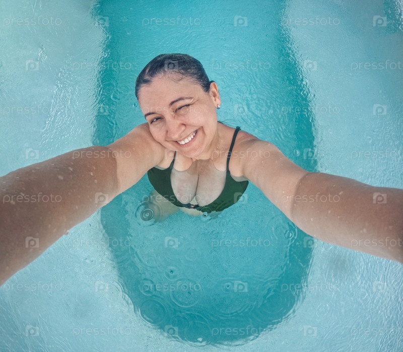 Улыбающаяся женщина в черном купальном костюме делает селфи в освежающем бассейне, демонстрируя радость и расслабление в яркой водной среде с чистой голубой водой