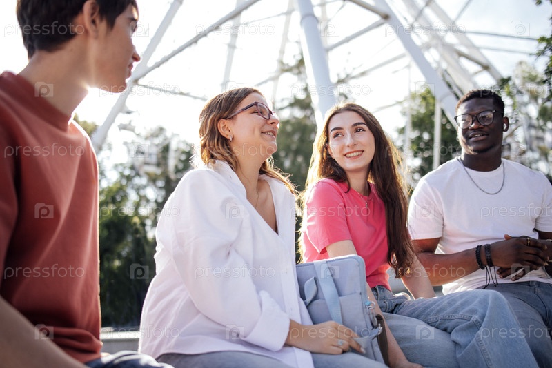 Группа разнообразных молодых взрослых, наслаждающихся солнечным днем на свежем воздухе, делятся смехом и разговорами, создавая радостную атмосферу дружбы и связи в яркой обстановке