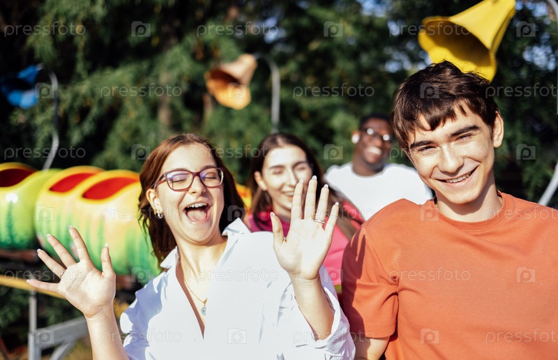Группа разнообразных молодых взрослых наслаждается веселым днем в парке развлечений, улыбаясь и махая рукой, с цветными горками и аттракционами на заднем плане, захватывая радостные моменты дружбы