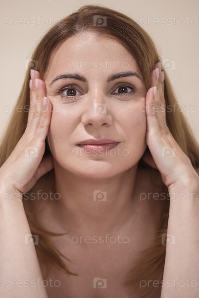 Женщина с длинными коричневыми волосами, нежно держащая лицо обеими руками, демонстрируя созерцательное выражение лица на мягком нейтральном фоне, передающая эмоции и интроспекцию