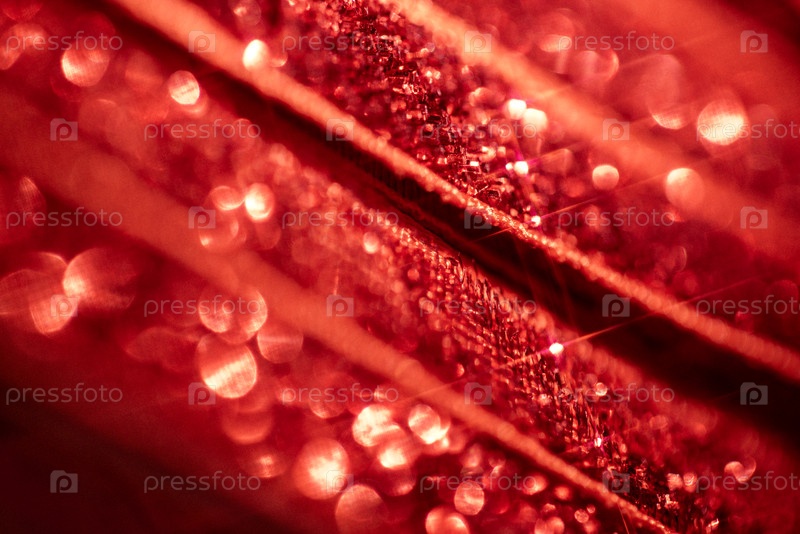Близкий план красной текстурированной поверхности с капельками воды и искрящимися выделениями, демонстрирующими сложные узоры и отражения в яркой теплой цветовой палитре