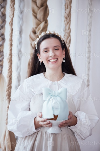 Молодая улыбающаяся женщина держит белую стойку с пасхальным тортом, украшенным большой синей лукой