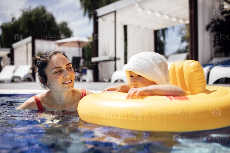 Женщина с темными волосами улыбается ребенку в желтом плавателе, наслаждаясь солнечным днем у бассейна, окруженная креслами и яркой зеленью, захватывая радостные летние моменты
