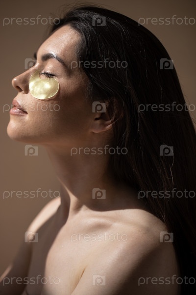 Женщина с длинными темными волосами расслабляется, нося золотые пластыри под глазами, демонстрируя привычку ухода за кожей в спокойной обстановке с мягким освещением и натуральными тонами