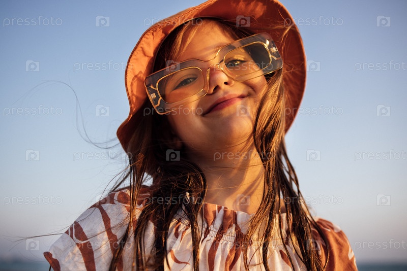 Молодая девушка с длинными волосами, носящая большие очки и апельсиновую шляпу улыбается в камеру на фоне чистого синего неба у пляжа во время заката