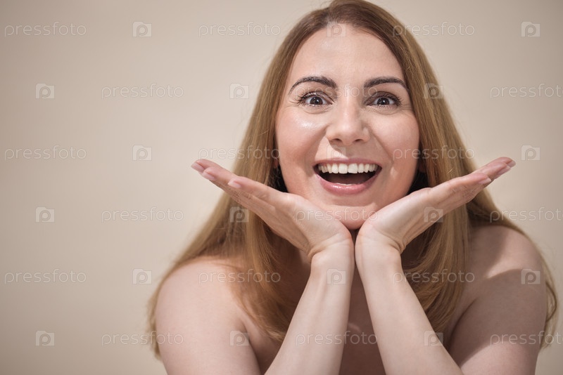 Улыбающаяся женщина с длинными коричневыми волосами, руки на щеках, выражая радость и счастье, на мягком нейтральном фоне, захватывая момент чистой радости и позитивности