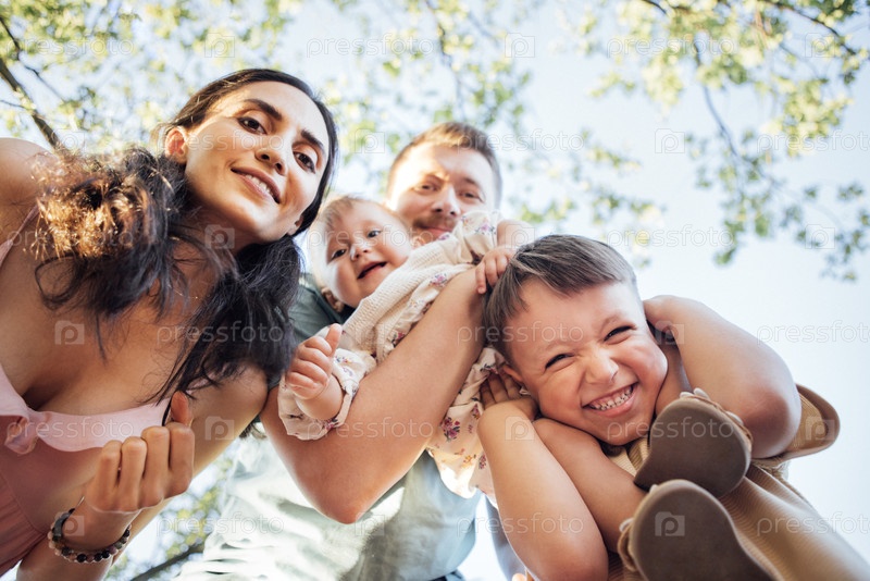 Семейный портрет с радостной группой из четырех человек, включая двух детей, наслаждающихся солнечным днем на свежем воздухе, в окружении зелени и захватывающих момент счастья и связи