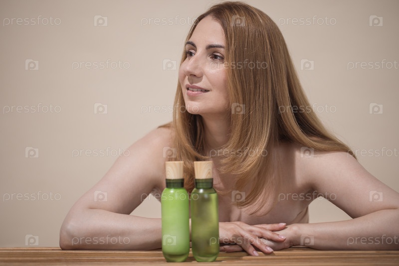 Женщина с длинными волосами грациозно позирует рядом с зелеными бутылками по уходу за кожей на деревянном столе, демонстрируя продукты красоты в спокойной и естественной обстановке, подчеркивая самообслуживание и благополучие