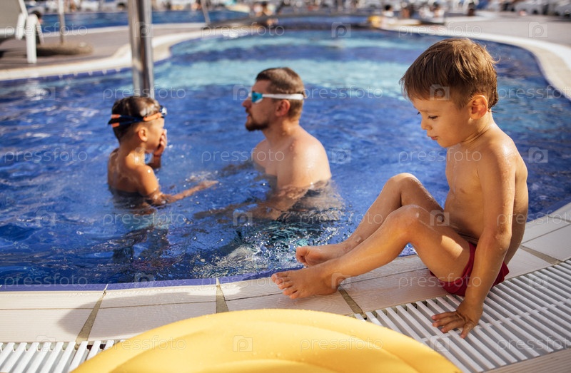 Маленькие дети и отец наслаждаются солнечным днем у бассейна, один ребенок играет в воде, а другой сидит на краю, создавая радостную семейную атмосферу