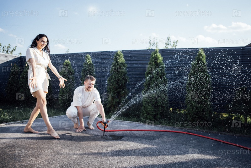Веселая пара наслаждается игривым распылением воды из садового шланга, стоя на бетонной поверхности, окруженная зеленью, захватывая веселый летний момент в открытой обстановке