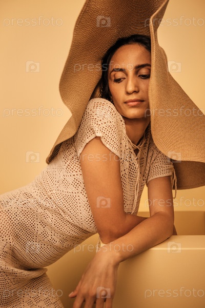Элегантная женщина с длинными темными волосами, одетая в стильное вязаное платье и огромную солнечную шляпу, грациозно позирует на мягком желтом фоне, воплощая летнюю моду и спокойствие