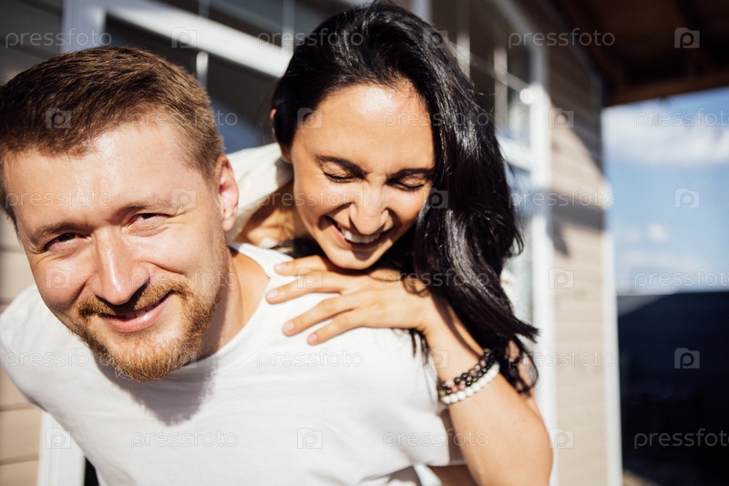 Улыбающаяся пара наслаждается игривым моментом на свежем воздухе, причем один из партнеров дает прогулку на спине пигги, демонстрируя радость и связь в яркой солнечной среде