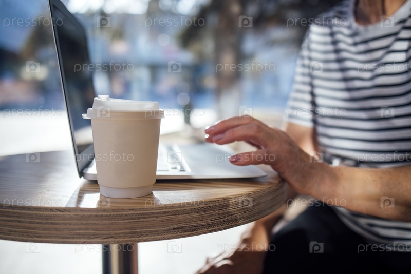 Зрелый человек, использующий ноутбук на деревянном столе с одноразовой чашечкой для кофе, одетый в полосатую рубашку, в ярком наружном окружении с размытыми элементами фона