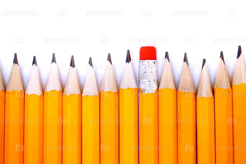 Желтые карандаши расположены в ряд с одним карандашом с красной удалкой, выделяющейся среди остальных на белом фоне