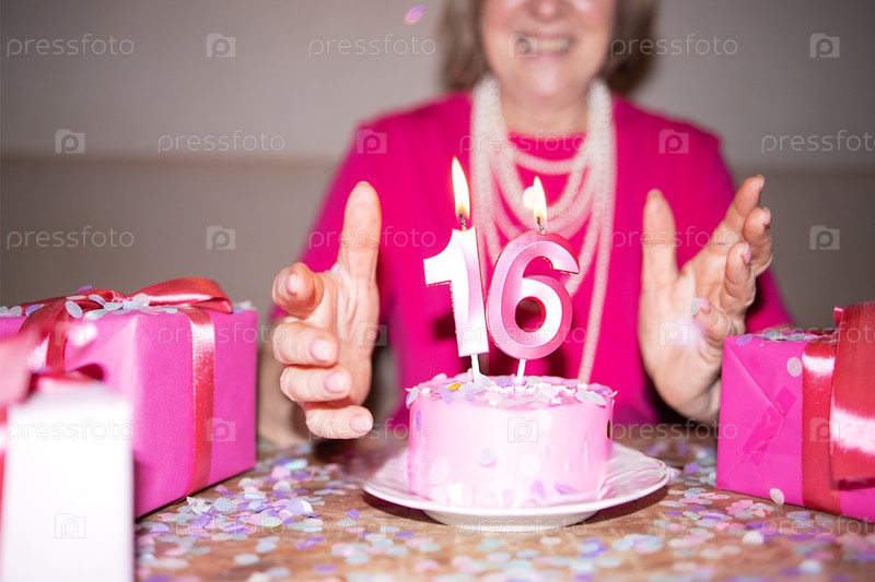 Женщина празднует свой 16-й или 61-й день рождения с розовым тортом и свечами, окружена розовыми коробками для подарков и красочными конфетти на украшенном столе