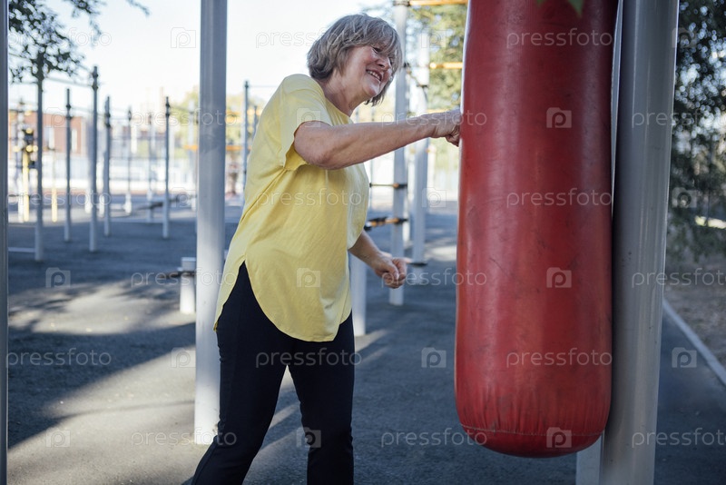 Пожилая женщина в желтой рубашке бьет красный боксерский мешок на открытом фитнес-зоне, окруженная тренажерным оборудованием и деревьями в общественном парке