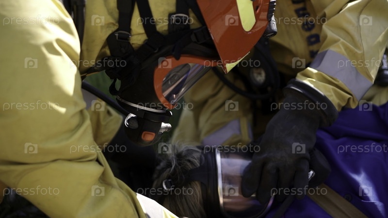 Пожарные дают кислород женщине, пострадавшей от пожара. Клип. Ближайшее изображение первой помощи после катастрофы