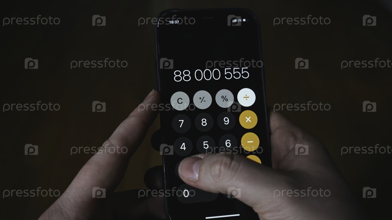 Ближайшее изображение человека, умножающего по телефону.СМИ.Человек считает счета за бухгалтерский учет по телефону.Расчет на калькуляторе в телефоне