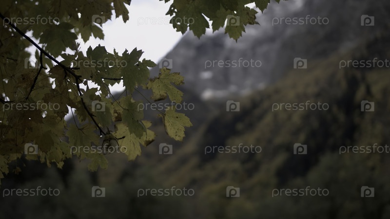 Древесные ветви и горы на фоне, осенний пейзаж.Креативное творчество.Осенние листья деревьев и лес