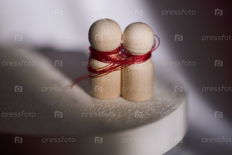 Две деревянные фигурки связаны между собой красной нитью на круговой основе, мягкое освещение создает тонкий эффект тени, подчеркивающий связь между фигурами
