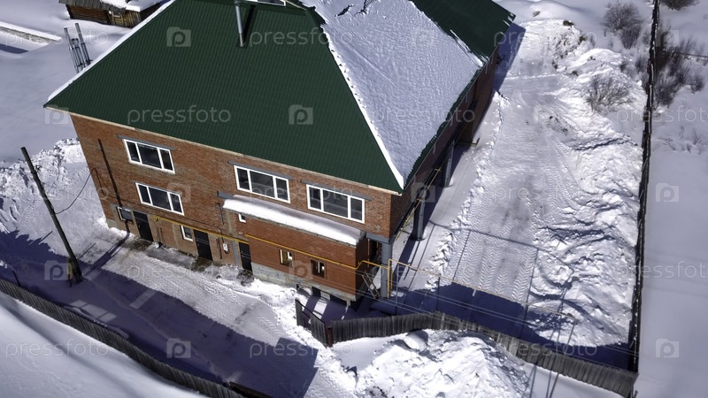 Вид с воздуха на деревню зимой, детали сельской местности. Клип. коттедж из красного кирпича и небольшие дома, снежный грунт