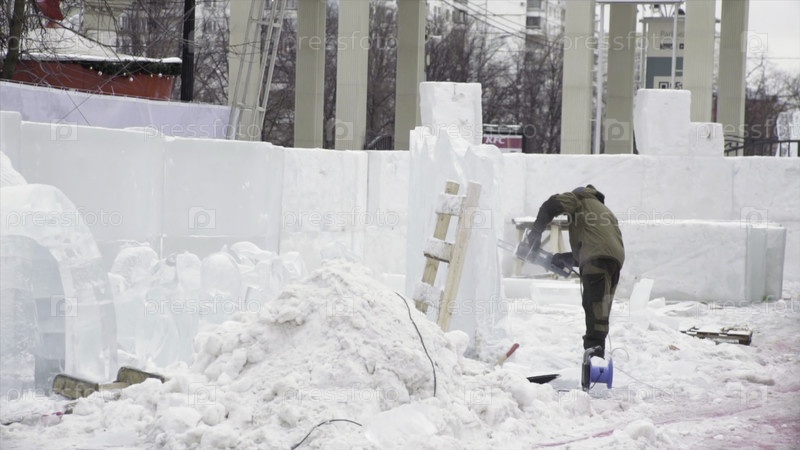 Опытный ремесленник вырезает ледяные скульптуры в спокойном зимнем ландшафте