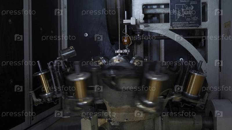 Катушки с медной проволокой вращаются на машине.Креативные.Катушки из медной проволоки, вращающиеся на промышленной машине.Металлургический завод с автоматизированным оборудованием для производства проволоки