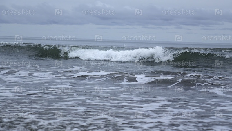 Морской пейзаж из красивых волн в пасмурный день. Клип. Красивые прибрежные волны на фоне горизонта с облачным небом. Прибрежные волны Северного моря в пасмурный день