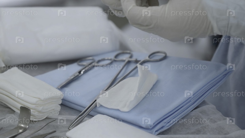 Подготовка к операции, стол с хирургическими инструментами. Действие. Почистить руки медсестры в резиновых перчатках, разрезая стерильную марлевую ткань