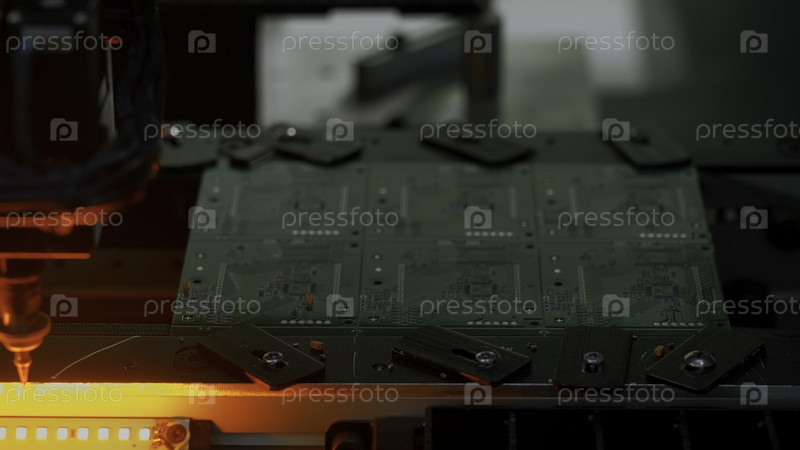 Машина покрытия для печатных плат на работе.Креативность.Закрыть автоматизированный робототехнический механизм, делающий плату