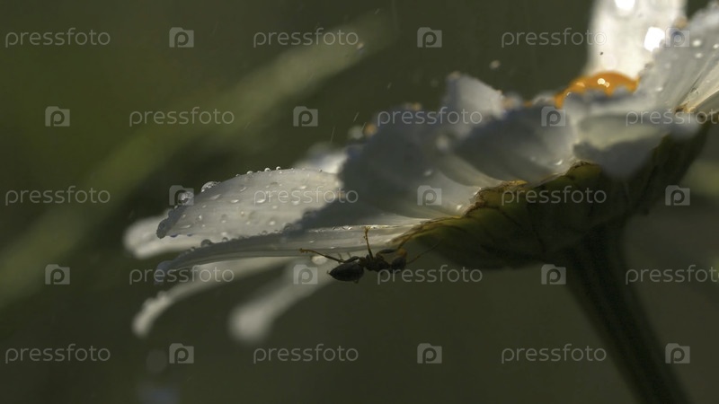 Цветок с муравьем поливается водой.Креативно.Муравей ползает по красивому цвету в саду.Мур на цветке с каплями воды в солнечный день