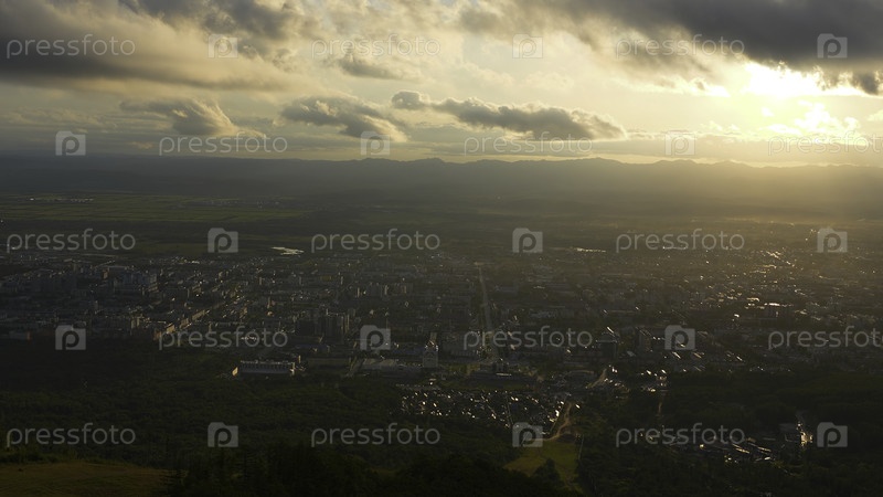 Вид сверху города в зеленой долине со солнцем на горизонте. Клип. Красивый пейзаж солнечной зеленой долины с городом в летний день. Яркое солнце светит вниз по долине с городом