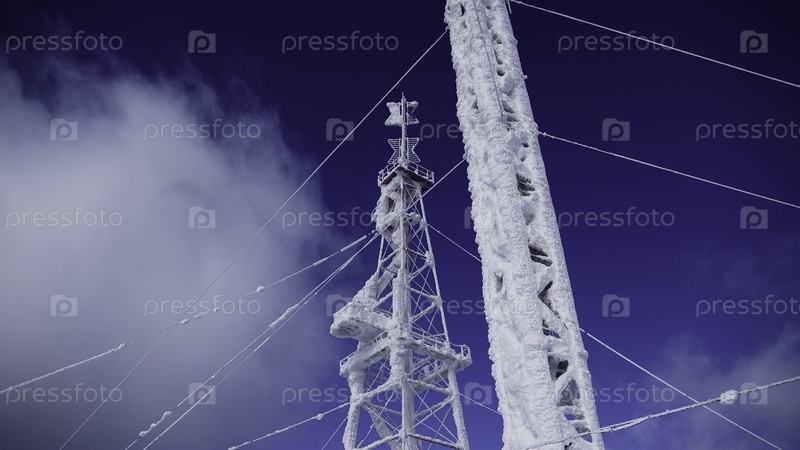 Высоковольтные провода и столбы покрыты морозом на голубом облачном зимнем небе