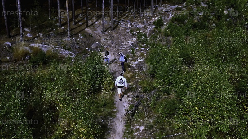 Счастливые друзья гуляют по летнему лесу. Кадр. Аэрофотосъемка похода на зеленой тропе, концепция активного образа жизни
