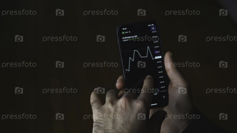 График торговли криптовалютами мобильный телефон. СМИ. Близкий план человека, смотрящего на валютный график на своем телефоне. Диаграмма криптовалюты на фондовой бирже с вашего телефона