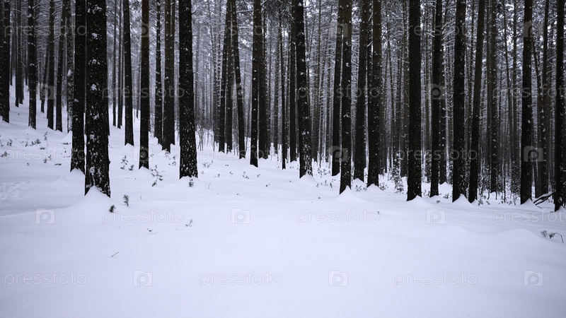 Сосновый лес в снегу.СМИ.Зимний лес с покрытыми снегом деревьями и медленно падающими снежинками