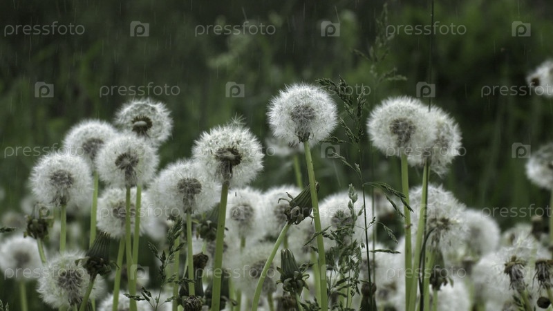 Летний дождь с луговыми одуванчиками. креативность. летний цветочный ландшафт с круглыми адвунами в дождливый день. летний дождь на лугу с пушистыми адвунями