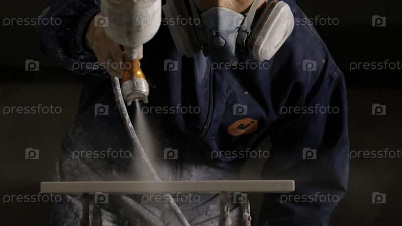 Близкий снимок мужского плотника, руки которого распыляют лак или праймер с использованием сжатого воздуха на деревянной доске