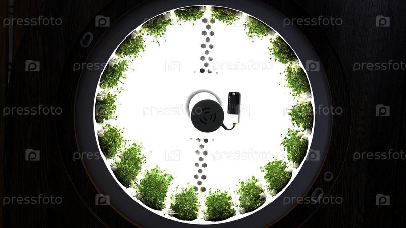 Микрозеленые садовые крессы Саженцы СМИ Близкий снимок выращивания зеленых съедобных растений в вращающейся ферме