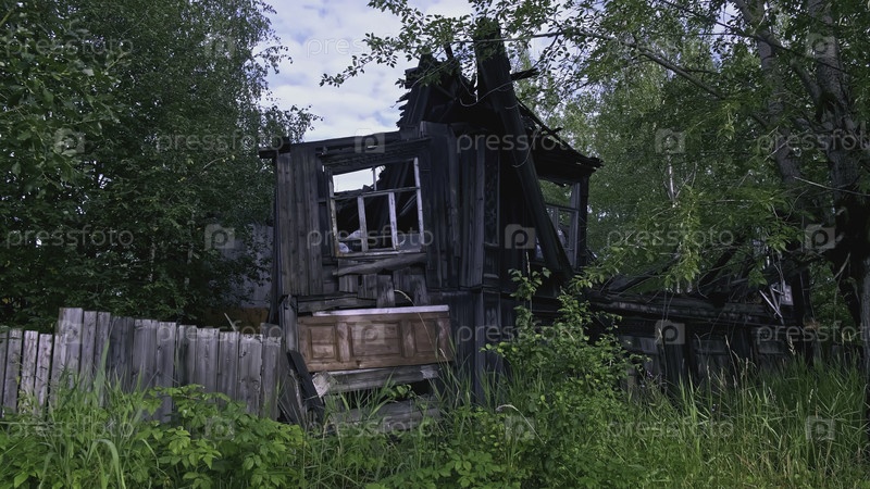 Заброшенный деревянный дом в деревне.Клип.Разрушенный деревянный дом в заброшенной деревне.Ужасающий разрушенный деревянный дом в зеленом лесу летом