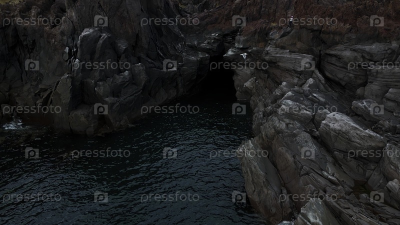 Эпический пейзаж на островной скале и голубом море.Клип.Путешествие ближе к маленькой неизвестной темной пещере