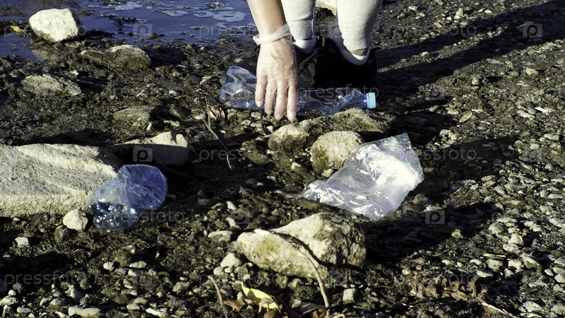 Работа в команде очищает пластик на пляже.Движение.Волонтеры собирают мусор с берега реки, загрязнение пластмассой и концепцию экологической проблемы