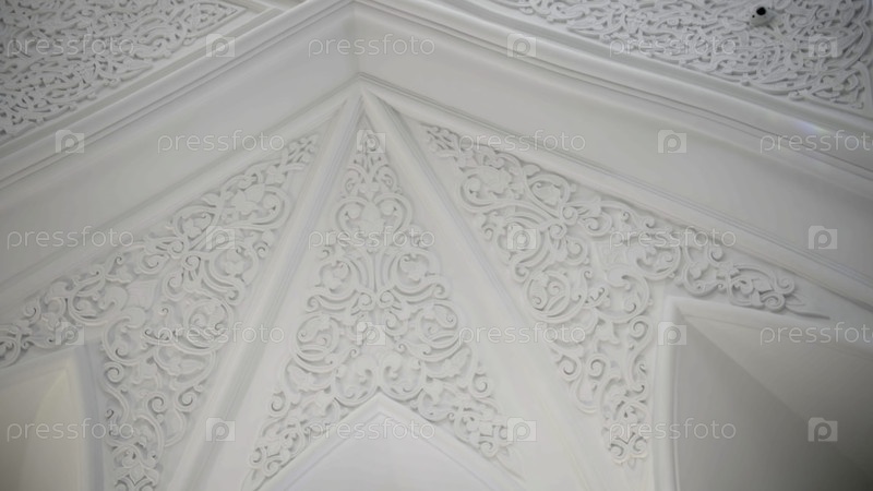 Низкий угол изображения интерьера мечети. Сцена. потолок внутри величественного храма, резные орнаменты на белых стенах и потолке