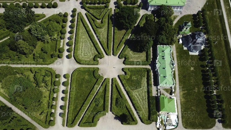 Вид сверху на королевский сад с узорами и древними зданиями. творческий. удивительная красота садового рисунка и тропы царского дворца. территория старого богатого поместья с садом в солнечный летний день