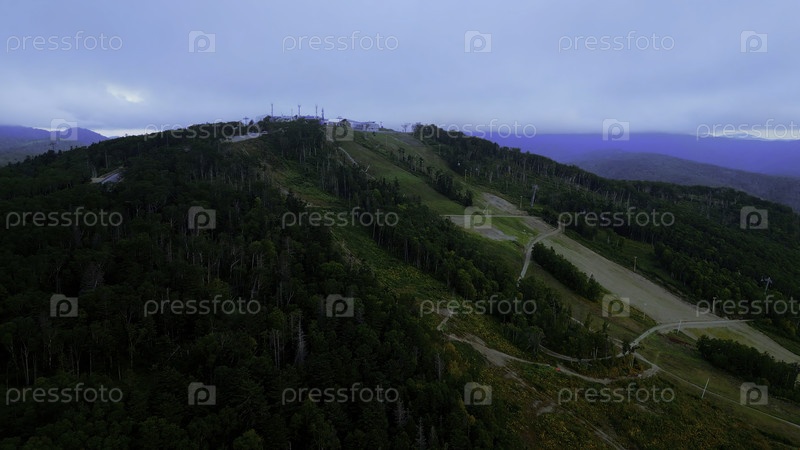 Вид с воздуха канатных дорог в горах. Клип. Путешествия и активные занятия на открытом воздухе, холмы, хвойные деревья и синее небо