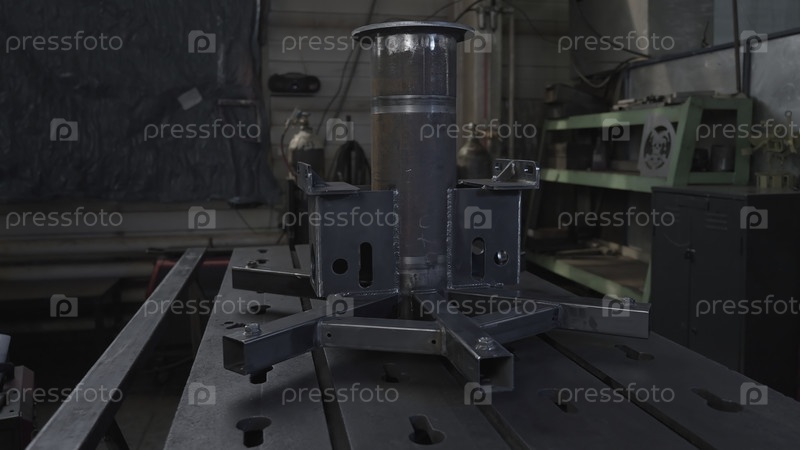 Предварительно сконструированная стальная конструкция в фабричной мастерской.Креативное.Сварное строительство из стали для завода.Фласка с металлической конструкцией для заводских машин