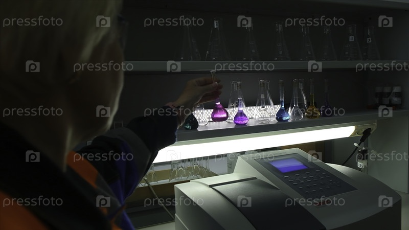 - Берлин, Германия, 15 мая 2023 года: Женщина в лаборатории наливает жидкость во флаконы.Клип.Женщина в униформе заливает цветную жидкость для химического анализа.Женщина проводит химический анализ яркой жидкости в лаборатории