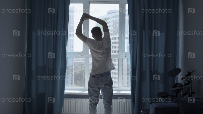 Силуэт мужчины, открывающего шторы и смотрящего в окно утром, концепция начала дня СМИ Молодой человек растягивается и смотрит через окно