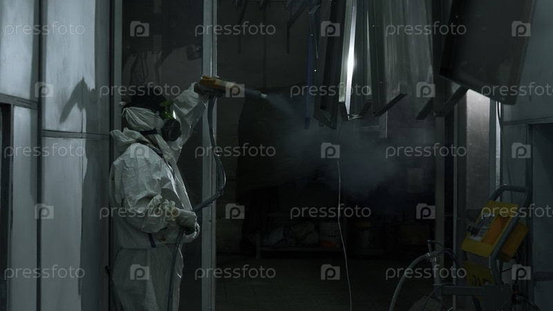 Процесс порошкового покрытия металлических деталей на сталелитейном заводе.Креативность.Рабочий в защитном костюме с пистолетом краски